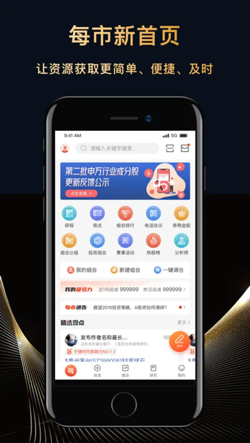 在每市,各个领域的专业研究人将他们的研究智慧通过组合配置、调仓以及观点实时传递。投资人,则通过自选股、模拟组合、研究人三个维度接收和筛选自己关注的信息。投研人员可针对任何调仓或观点进行主题私聊。