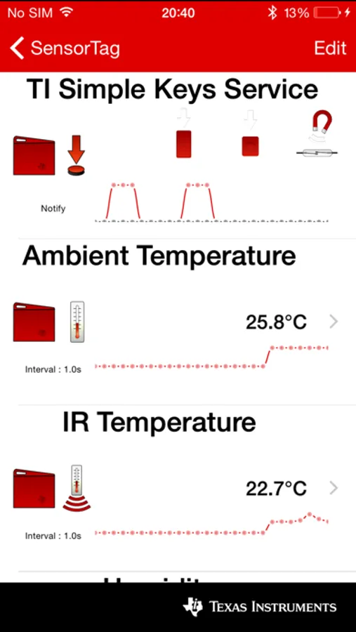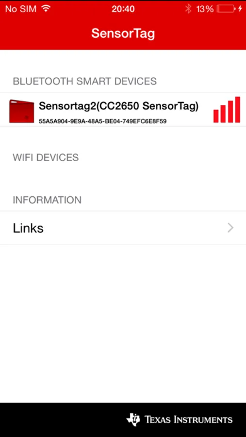This app connects all your Simplelink(TM) Sensortags and Launchpads to your smartphone and the cloud with Bluetooth Low Energy and WiFi support. Includes support for Over-the-Air upgrades for all development platforms. Cloud connectivity is supported through MQTT to any cloudservice or with dweet.io. To learn more, see the web links to each development kit.
