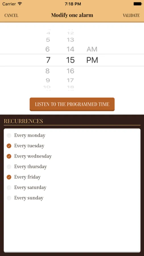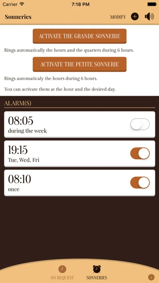 Besides to ring automatically at the hours and quarters of an hour it allows, on request, to listen to the exact time at any moment.