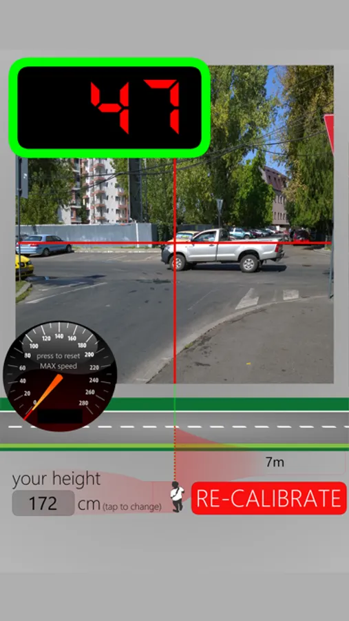 Enter your height, hold your phone to shoulder level (that is you normally do), point the thin red cross perpendicularly to the lane where cars are crossing and press CALIBRATE. Now you just have to follow the cars to get their speeds!
