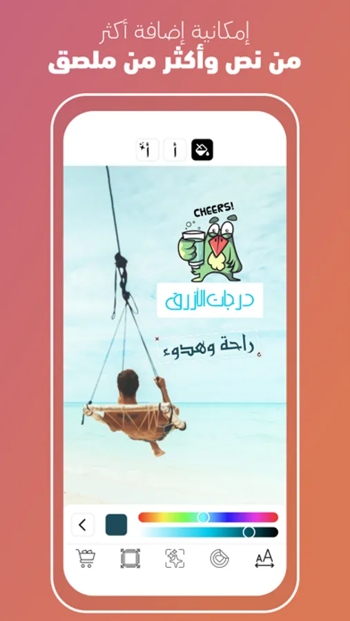 - امكانية تدوير النص والملصقات باللمس وباستخدام أداة شريط التمرير