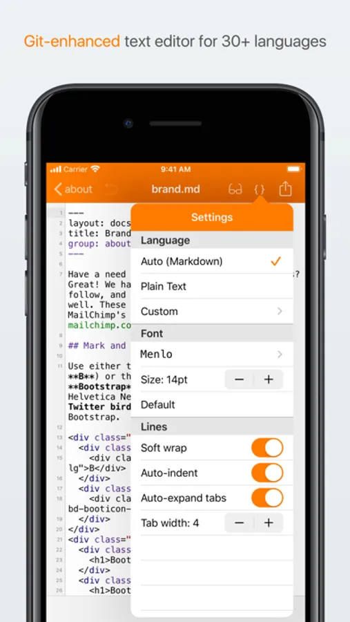 Be fearless with version control. Clone's text editor previews HTML and Markdown. Write your blog next blog post from your device. Clone's editor performs syntax highlighting in 30+ languages and shows line numbers so you always know right where you are. Customize with 5 elegant code fonts, configurable sizes, soft tabs, and line wrapping. It's built around Git, so commit, blame, and revert are always at your fingertips.