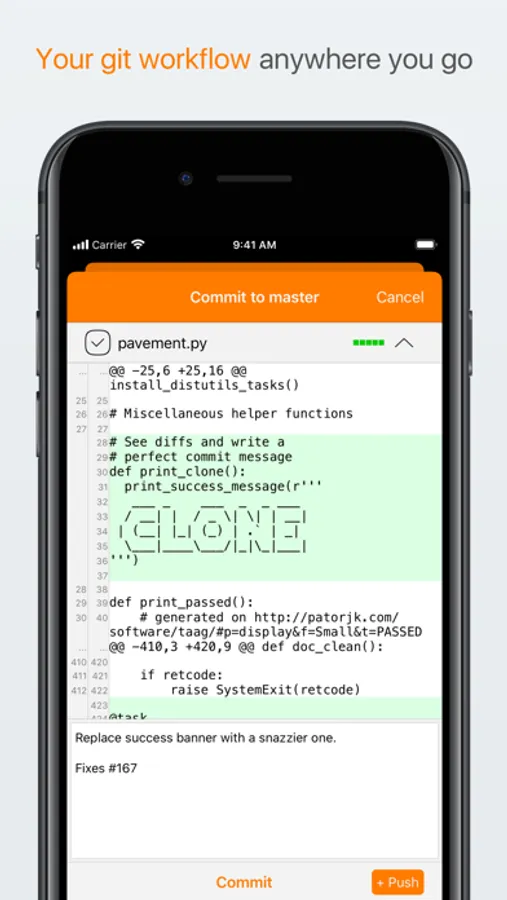 Pull, edit, commit, and push from any iOS device. Connect your GitHub or Bitbucket account for instant access to your public and private repos. Use a public key for password-free authentication. View diffs before committing, ignore files, and be a Git master without a command-line.