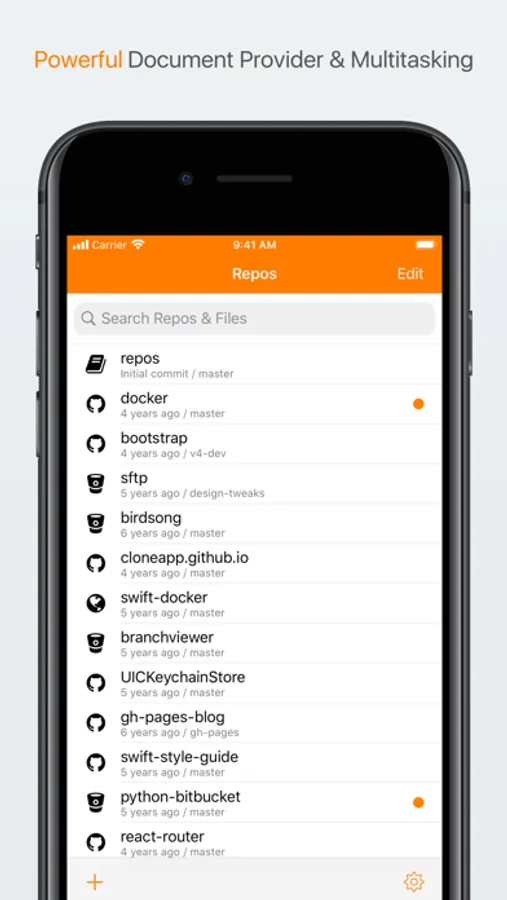 On all devices, Clone supports the latest iOS technologies. Use Clone as a document provider to edit code directly in your favorite editor, including Swift Playgrounds on iPads. Comparing your changes is only a swipe away with the Today view extension, even when editing in another app. Be more productive with iPad multitasking. You can work side-by-side. Write a blog post in Markdown from one app while previewing live in Clone. Commit and push are just a tap away too. Whatever the size, you're covered.