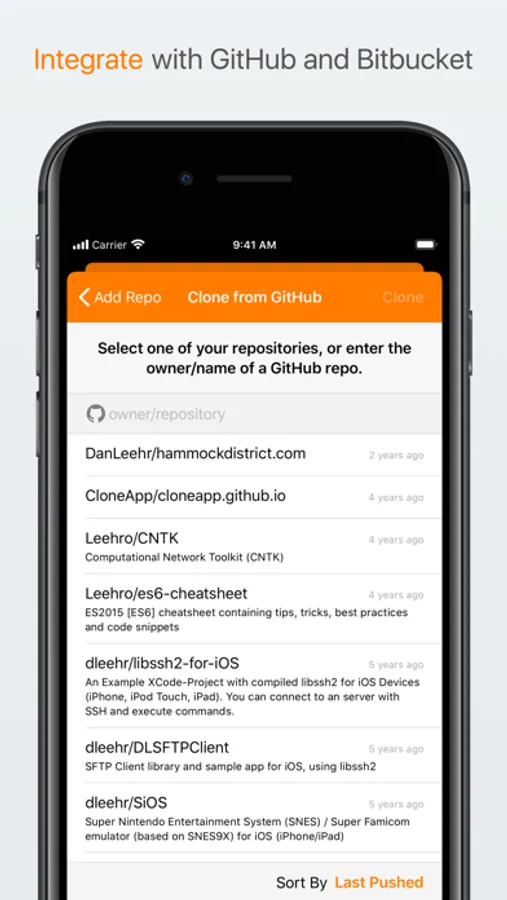 After connecting to your Github or Bitbucket account, you can clone your repos without typing a thing. Repos you create on your device can be published to GitHub or bitbucket in seconds.
