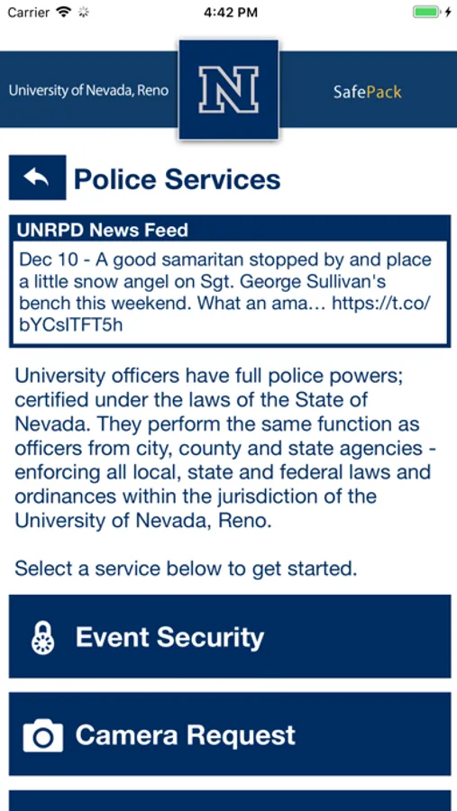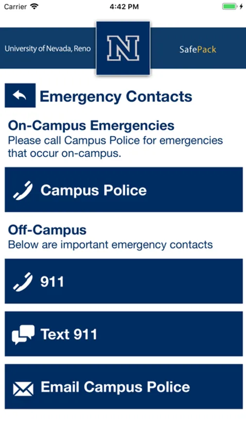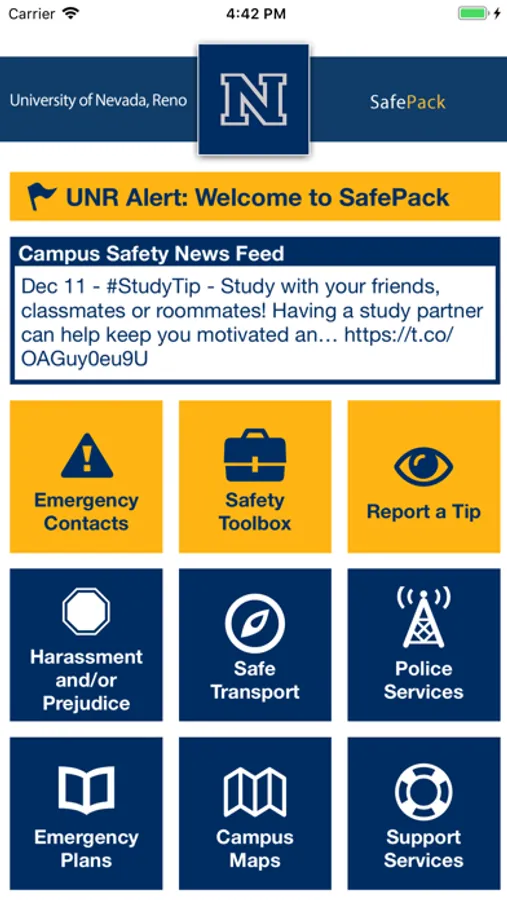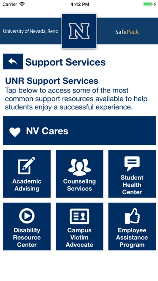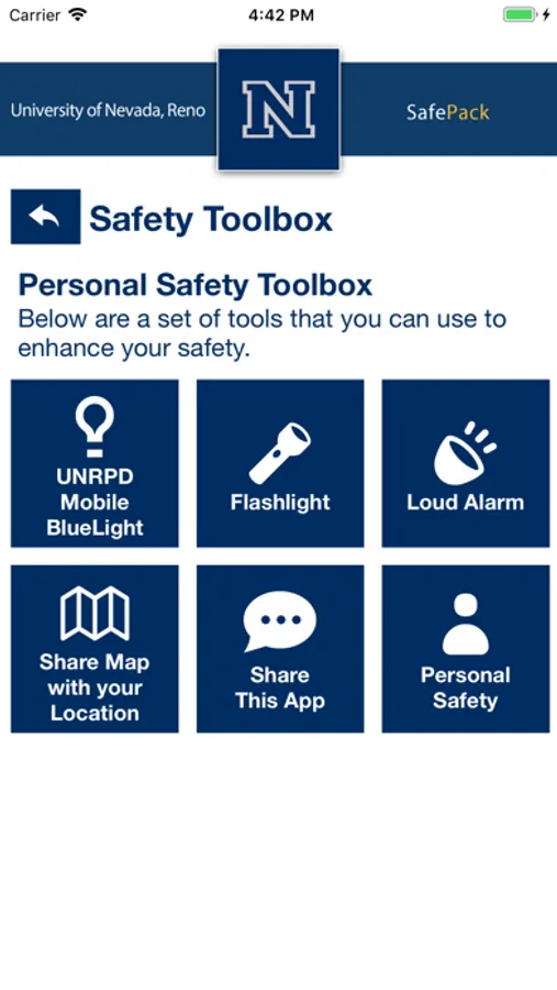 SafePack is an app developed for students and staff at University of Nevada, Reno. The app features include quick access to Campus Security, a personal safety toolbox, campus maps, on-campus support resources, and more!