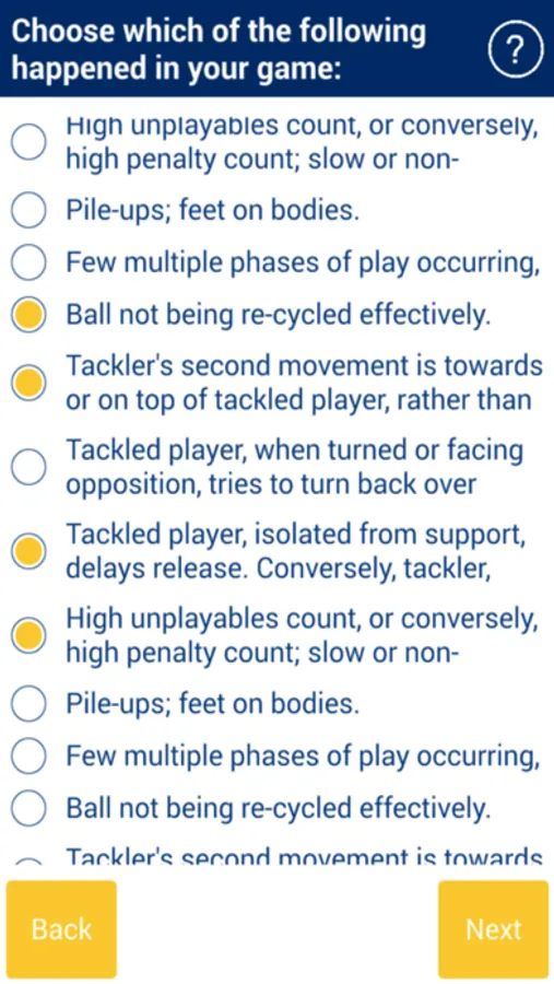 This app presents the content of the ARU's Rugby Referee Coaching in Practice book, and organizes it in a way that you can use it to self-assess a game of rugby that you have refereed.