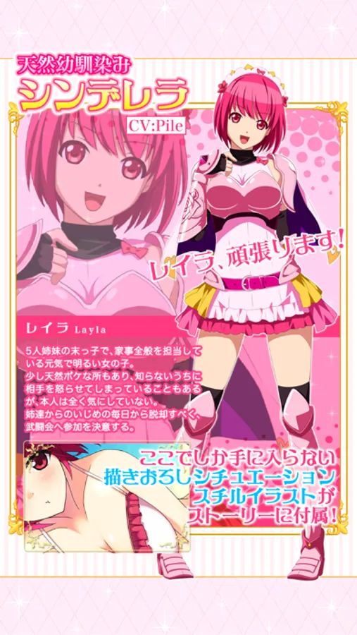 なんと主人公シンデレラのCVには今ラブライブ!でも大人気の声優アーティスト「Pile」が出演!しかも本作のためだけに200ワード以上の新規ボイスを収録!全ストーリー、ボイス付きで楽しむ事が出来るよ!