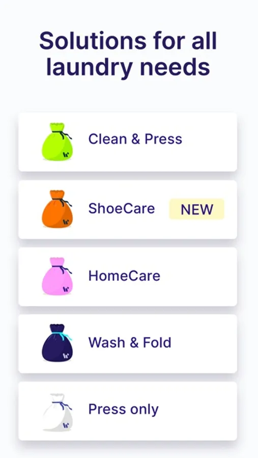 When you place your first order on our app, our driver will bring you our color-coded bags, so all you need to do is fill those bags according to the service you need: