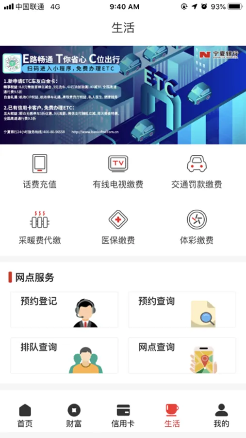 “网点查询”、“特惠商户”、“缴费充值”以及“积分兑换”为您的生活提供便利。