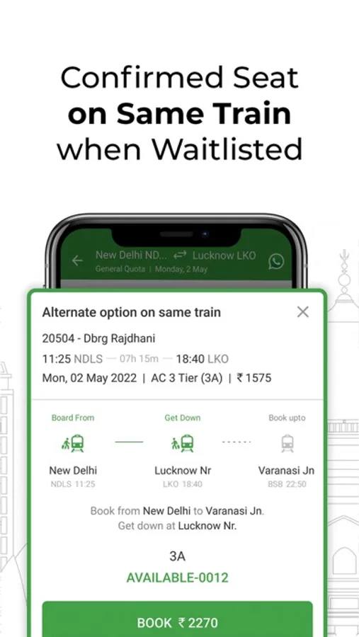 With ConfirmTkt same train alternates, you can find hidden confirm train tickets by changing your boarding/dropping point. With ConfirmTkt's accurate prediction, even if the ticket is on the waitlist, your ticket will get confirmed if the ConfirmTkt forecast is green, so go ahead and book your train ticket with assurance.