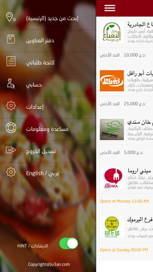 JU3AN allows you to order food delivery or takeaway from Restaurants IRAQ and JORDAN wide, right from your current location!