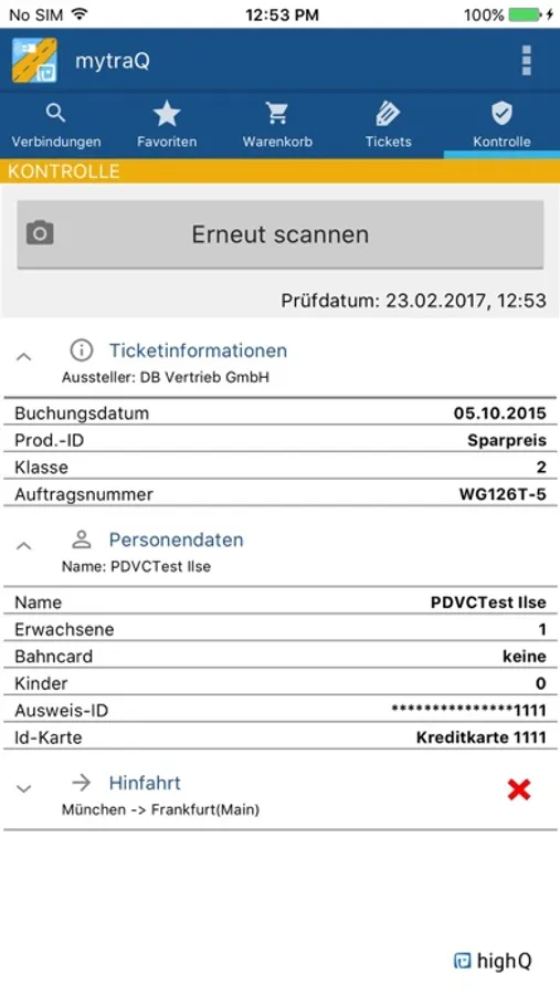 Mit der Mobile Traveller-App mytraQ von highQ scannen Sie schnell und einfach einen gedruckten 2D-Barcode oder lesen die Chip-Fahrkarte mit Hilfe eines NFC-Mobiltelefons aus. Die App öffnet sich automatisch, sobald Sie eine E-Ticket-Chipkarte (VDV-KA-Standard, (((eTicket-Deutschland) vor Ihr Kontroll-Handy halten. Sie teilt Ihnen direkt mit, auf welcher Strecke und wie lange die Fahrberechtigung gültig ist. So können Sie ganz entspannt kontrollieren und haben mehr Zeit, sich um die Belange Ihrer Kunden zu kümmern.