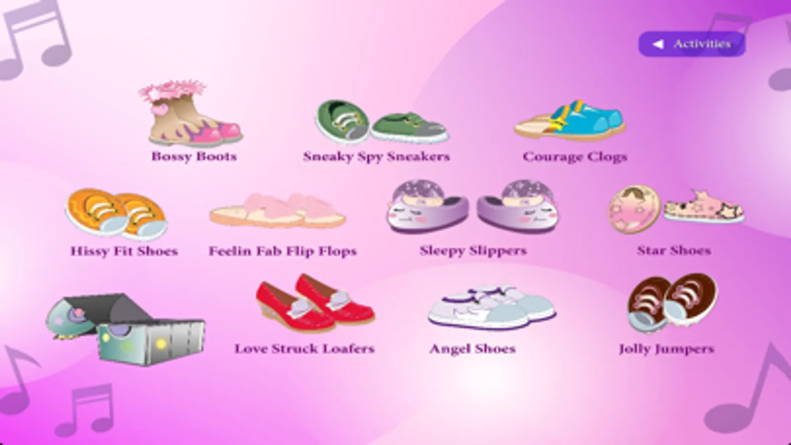 The storybook is followed by Activities Page, including ‘Musical Shoes, and Match the Shoe-Zees” Game.