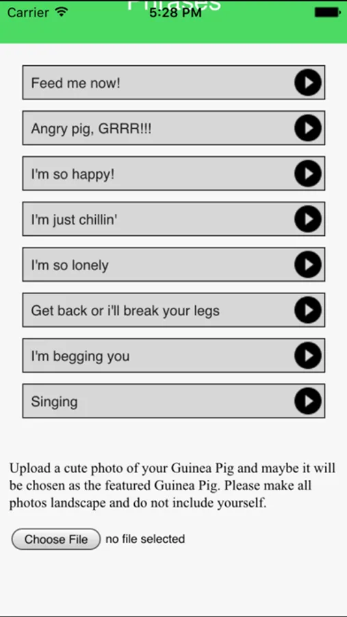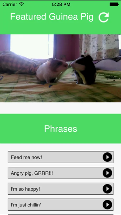 Hold the app near your Guinea Pig, turn the volume up and press one of the buttons to say something in Guinea Pig. If you listen carefully your Guinea pig may respond to what it hears.