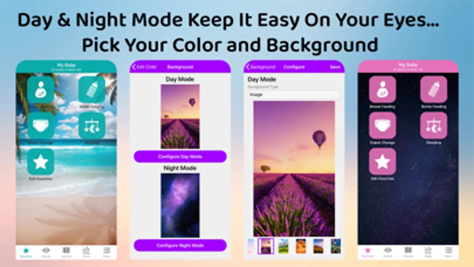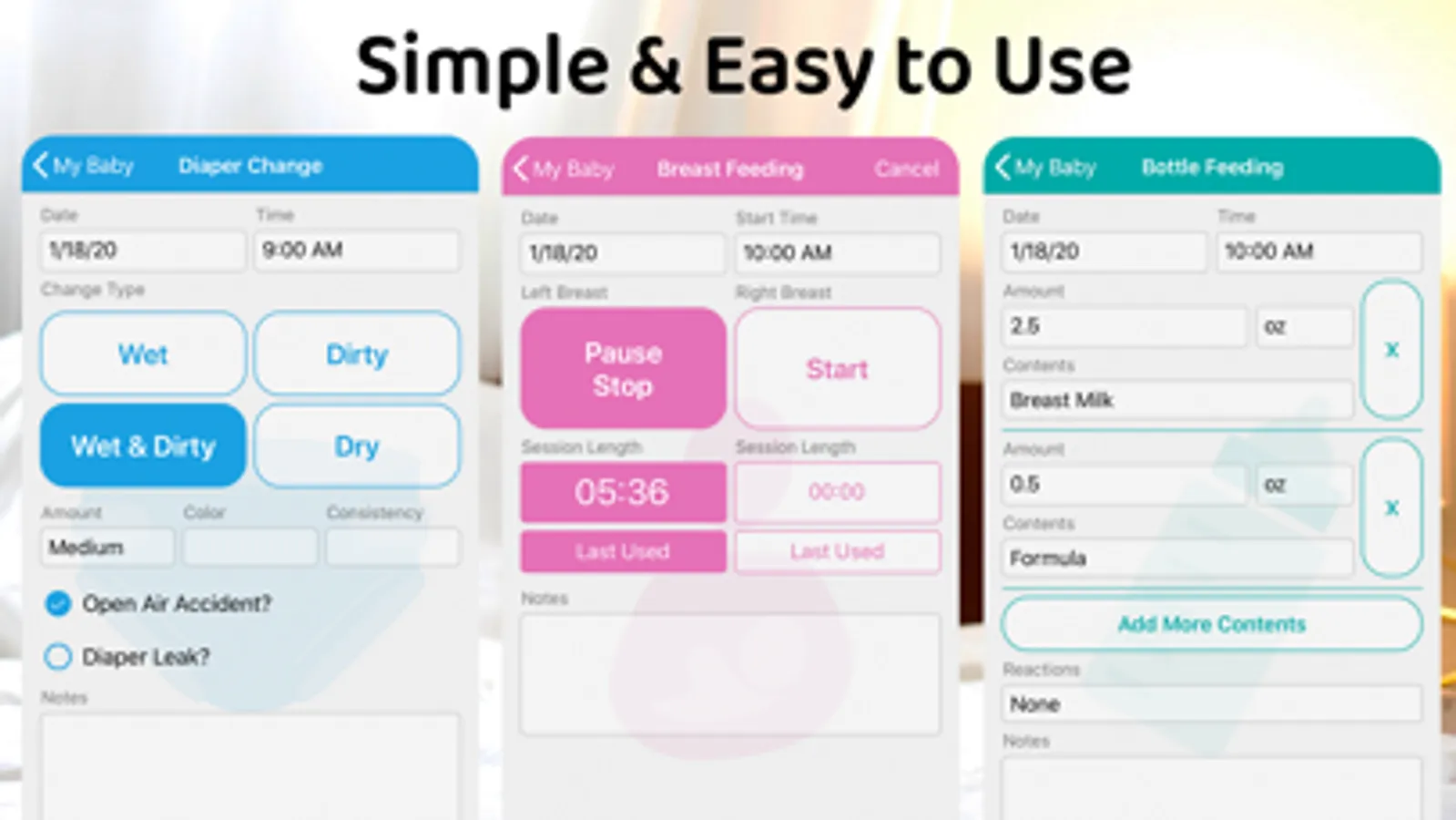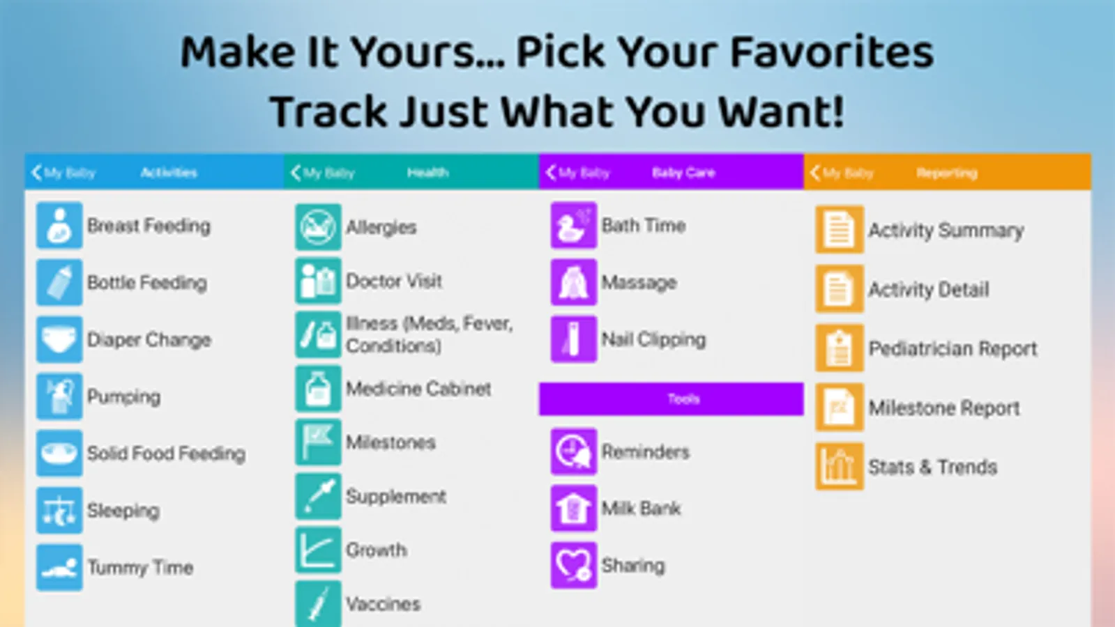 Taylor ParentLove to satisfy your individual needs. Favorites give you quick access to the activities you need allowing you to record events quickly and easily in as little as 2 taps! The data you record for each activity, such as a reaction or a bottle’s content, can be customized to suit you and your baby's individual needs. Timers allow you to record breast feeding, pumping and sleeping sessions.