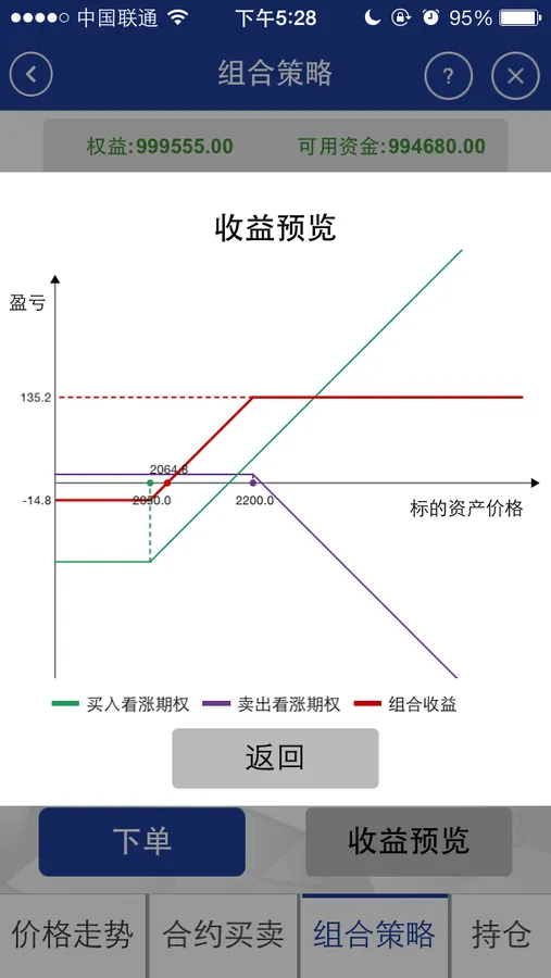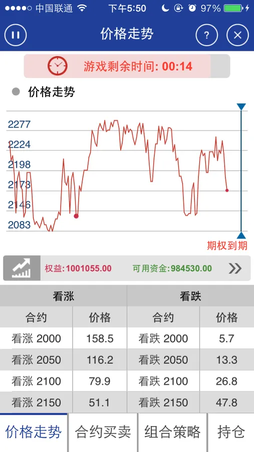 股指期权游戏分为期权交易体验(初级)和期权策略应用(进阶),初级是简单的期权交易,进阶则加入了组合下单,应对小涨、小跌、盘整及突破行情的期权组合策略。基于模拟行情,玩家可以随时随地体验股指期权交易,游戏结束后,玩家可回放交易过程。