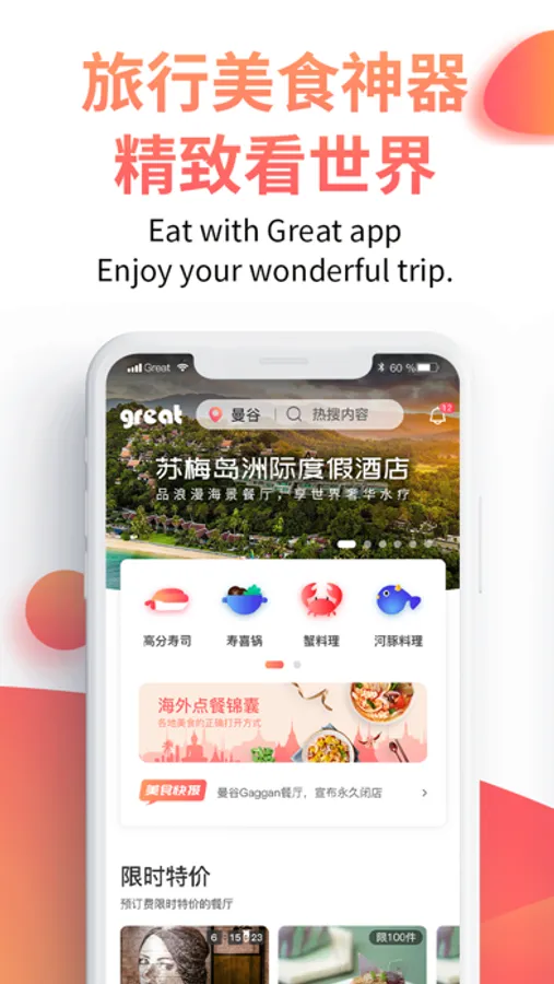 海外点餐助手great,提供出境游餐饮美食和地道玩乐体验的预订服务。
