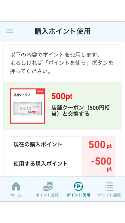 貯まった購入ポイントを500pt単位で交換頂くことが出来ます。(電子マネー、店頭値引きクーポンのいずれか、あるいは両方に交換となりますが、販売店毎に異なるため具体的な交換内容はお店にご確認ください)。