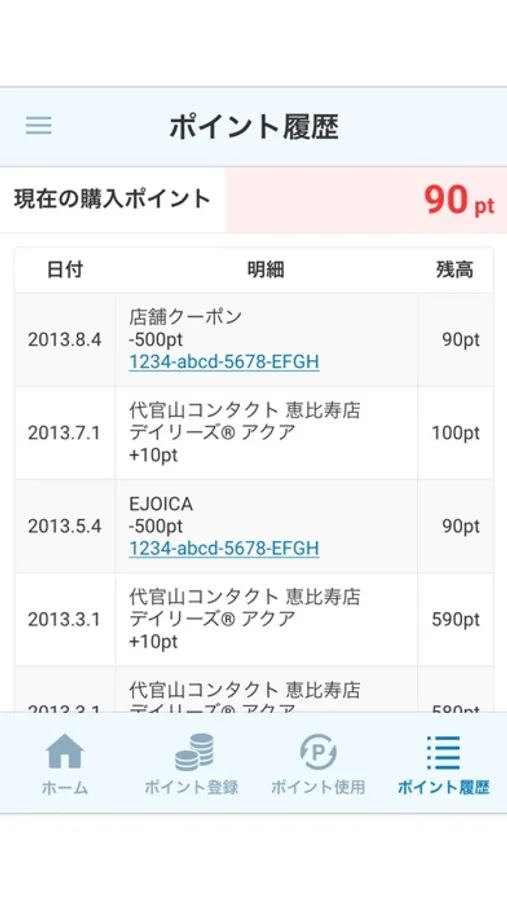 これまでに登録頂いたポイント、使用頂いたポイントそれぞれの履歴と、現在のポイント残高をご確認頂けます。