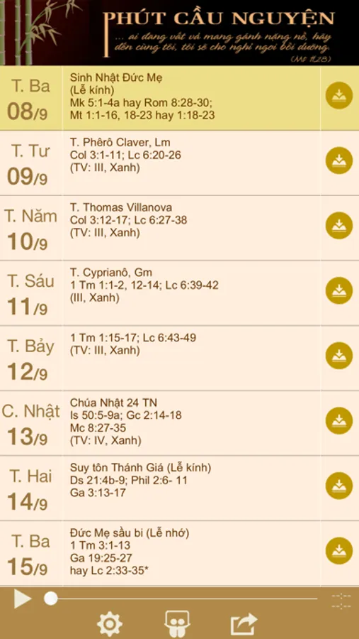 Bạn có thể nghe offline các audio bài đọc và suy niệm hằng ngày, bằng cách chạm vào nút download ở bên phải dòng thông tin mỗi ngày.