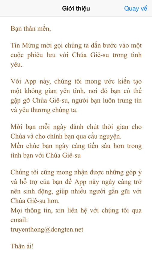 Với app này, chúng tôi ước mong kiến tạo một không gian yên tĩnh, nơi đó bạn có thể cầu nguyện và gặp gỡ Chúa Giê-su.