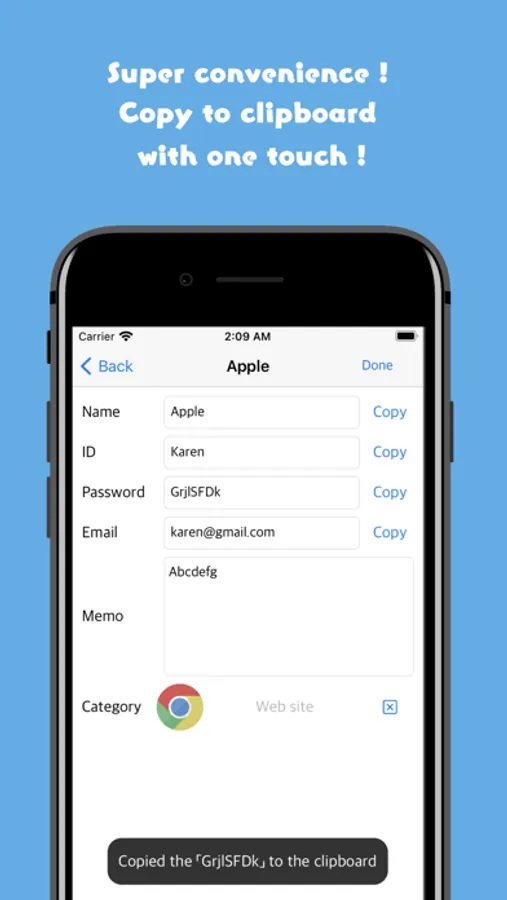 You can copy saved passwords etc. to the clipboard with one touch by pressing the copy button