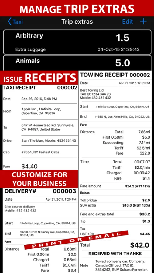 +FLEXIBLE EXTRAS. You can define your extras in advance and add to the trip easily or you can add arbitrary extra amounts to the trip as you drive. You can review trip extras at any moment to remove or edit them.