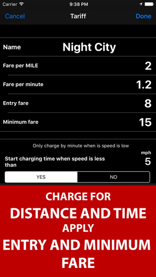 +UNLIMITED NUMBER OF TARIFFS. Each tariff allows to charge either for distance (miles or kilometers) or for time. It is even possible to charge for time only when speed drops under some configurable value.