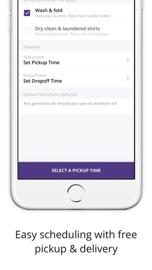 Download the app and schedule a pickup in minutes. We think your time should be spent doing something other worrying about laundry and dry cleaning. So we made it easy to schedule, manage, and pay for your pickup and deliveries from anywhere using our mobile app. So go ahead and say yes to more time with the family, more happy hours, and more slapping the snooze button every morning — we've got laundry day covered.