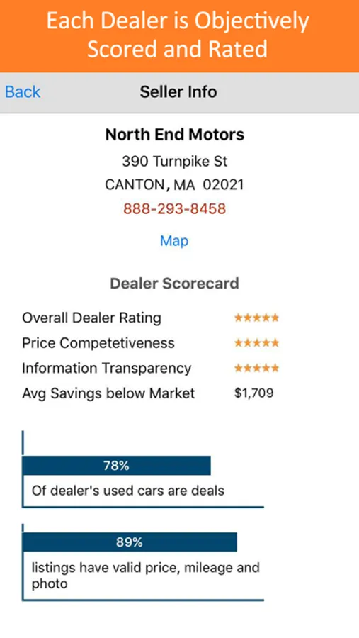While finding the perfect used car is great, it would be even better if the car was being sold by a trustworthy car dealer, not one that's out to scam the consumer. We use a number of signals to determine how price competitive a dealer is, how transparent the dealer is in disclosing information about the car, and how responsive it is in getting back to shoppers' inquiries and questions.
