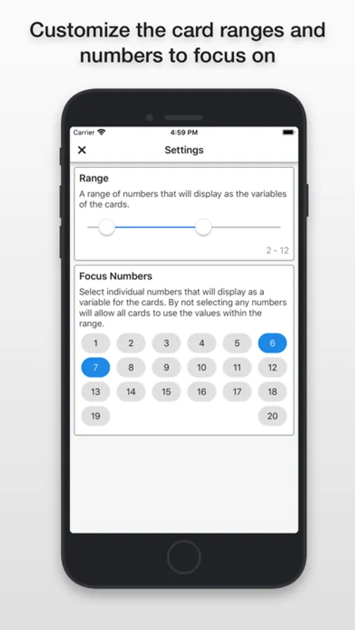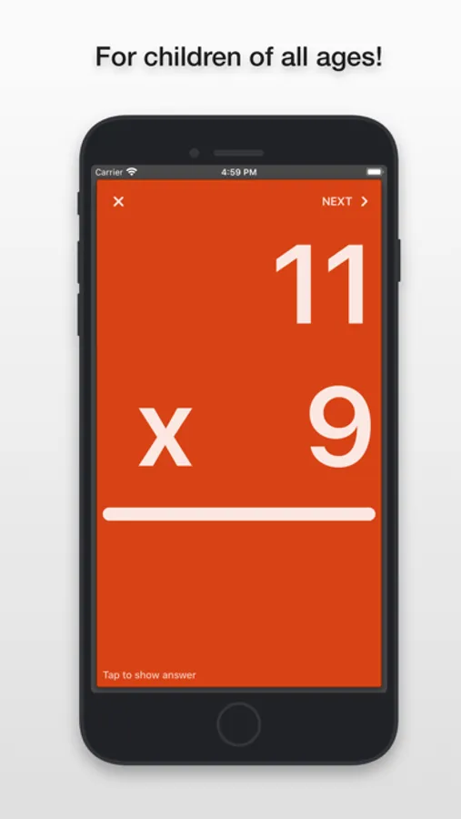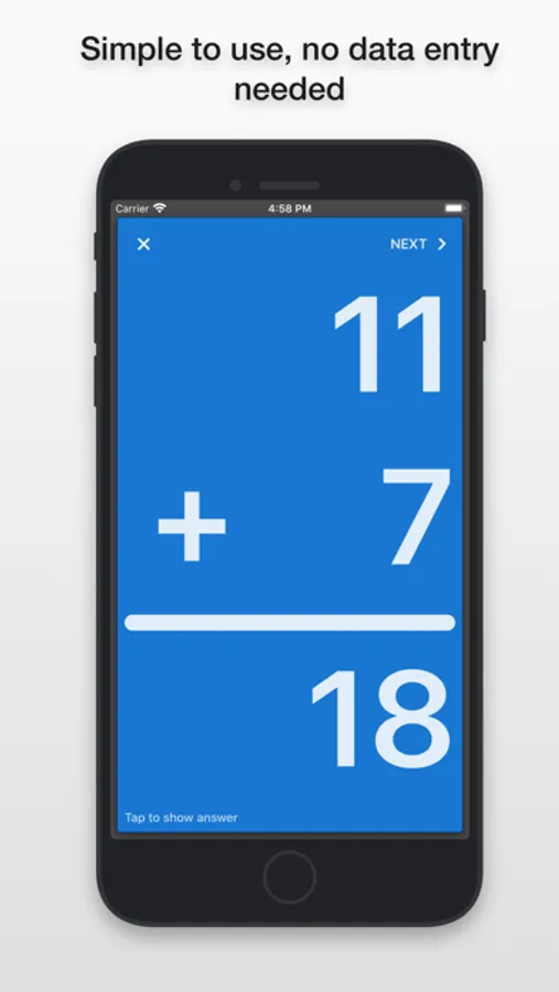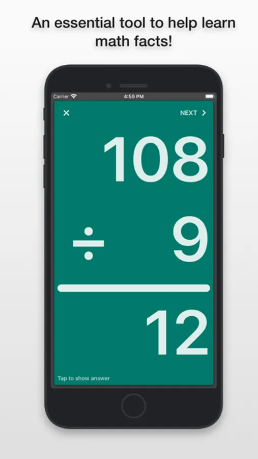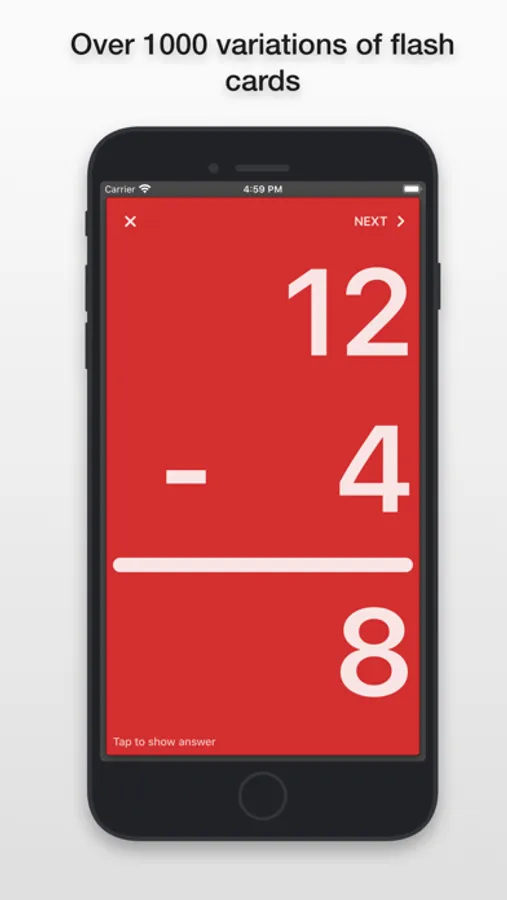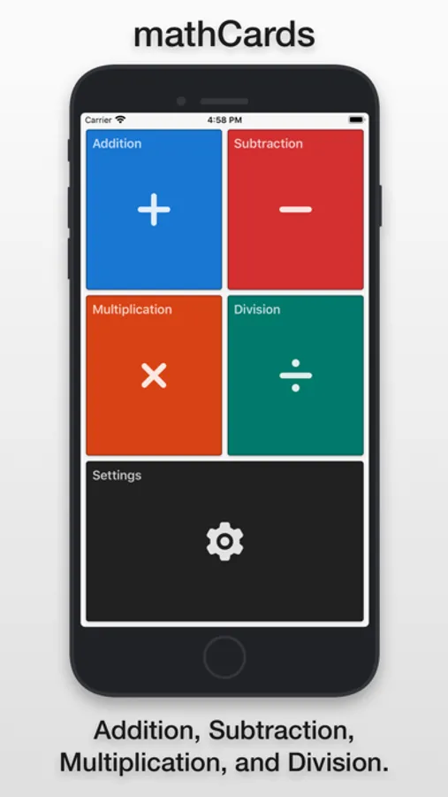 Once you open the app you have four options: Addition, Subtraction, Multiplication, and Division. Tap on whichever you'd prefer to use. A card with a problem will appear with no answer. To see the answer tap the screen and it'll appear. One more tap and that card will slide off the deck and the next card will appear instantly. You can also skip cards by a left swipe.
