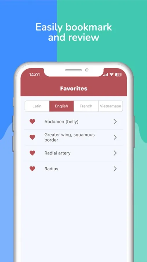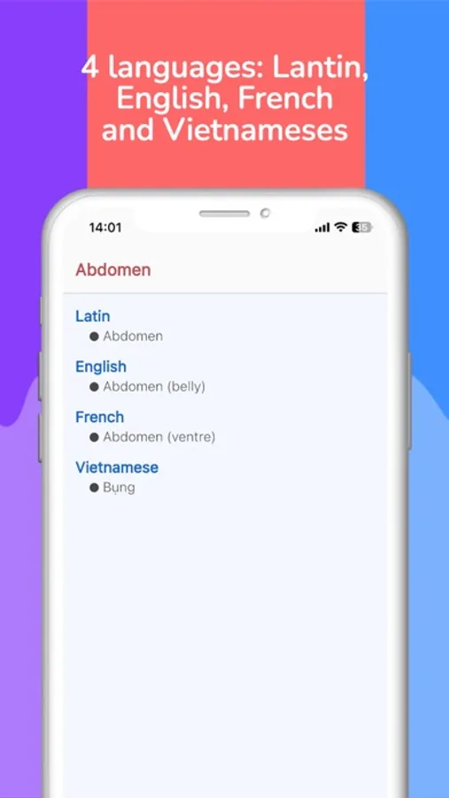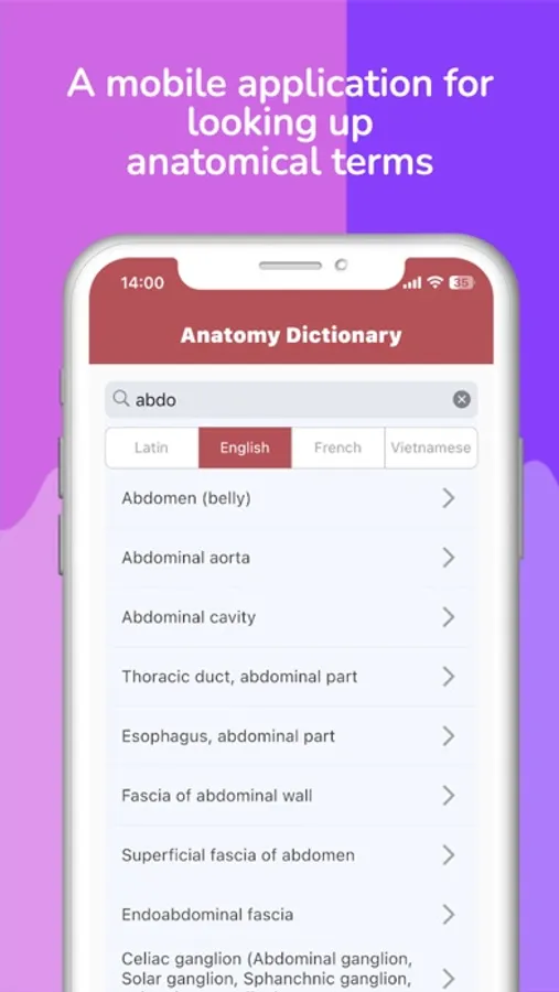Our app lets you easily look up anatomical terms in four different languages: Latin, English, French, and Vietnamese.