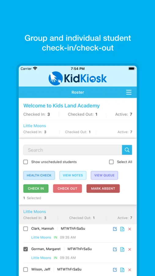 KidKiosk is a simple, super-efficient app for secure electronic check-in/check-out and attendance management of children. Parents enter a unique PIN at check-in/check-out. Administrators can view real-time attendance and archive attendance for up to 7 years! Save the hassle of paper attendance and archiving. KidKiosk sends notifications to parents when their child has been checked-in or checked-out. No more guess work!