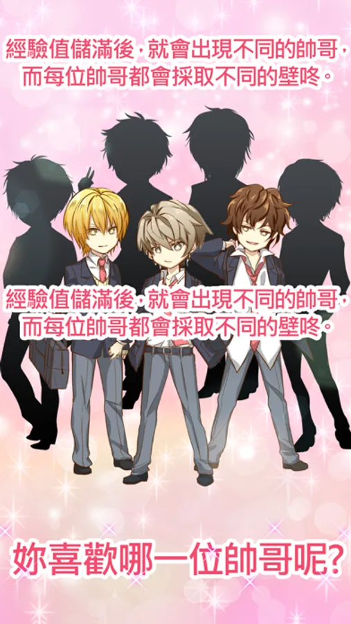 由妳來操作男高中生,藉著壁咚,來推展故事情節,而後就會有新的帥哥登場!