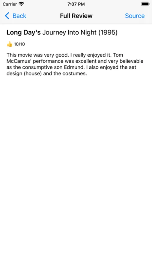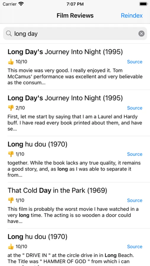 The search is powered by the Objective-C version of Apache Lucene, a popular search engine library. Because of that, you can perform boolean queries such as "great and movie". In the retrieved reviews, matching keywords are properly highlighted. You can search with either singular or plural word forms, since they are also handled by the search library. You can therefore also use this app to see how Lucene works with real-world texts from a well-known dataset and to understand the different aspects of full-text search.