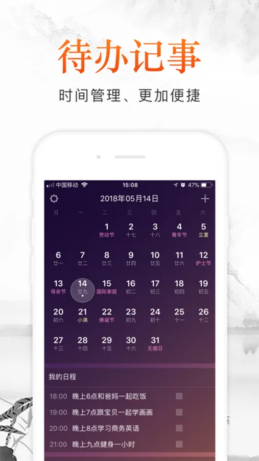 装上华人日历万年历,用上日程待办提醒功能,再也不用惦记这些事儿了。