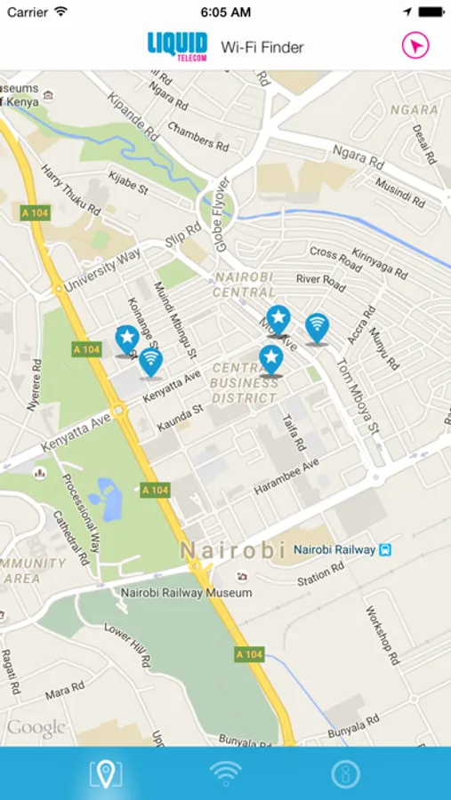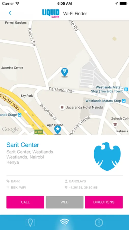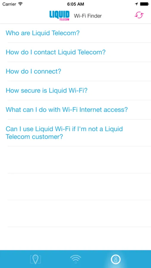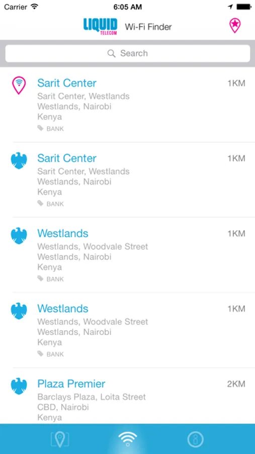 Wi-Fi hotspot finder from Liquid Telecom; you can find hotspots via either a map or a list of locations, with address and contact details for each. The app also has an FAQ on both Liquid Wi-Fi and BilaWaya Wi-Fi.