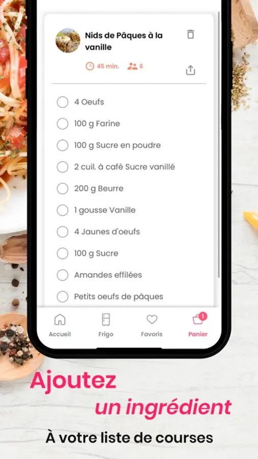 Une quiche vous a tapé dans l’œil mais il vous manque les œufs nécessaires à sa préparation ? Aucun souci, à partir de la recette, cochez les ingrédients qu’il vous manque et retrouvez-les dans votre liste de courses.