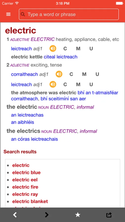 • Tapáil ar fhocal in iontráil chun aistriúcháin an fhocail sin a fháil;