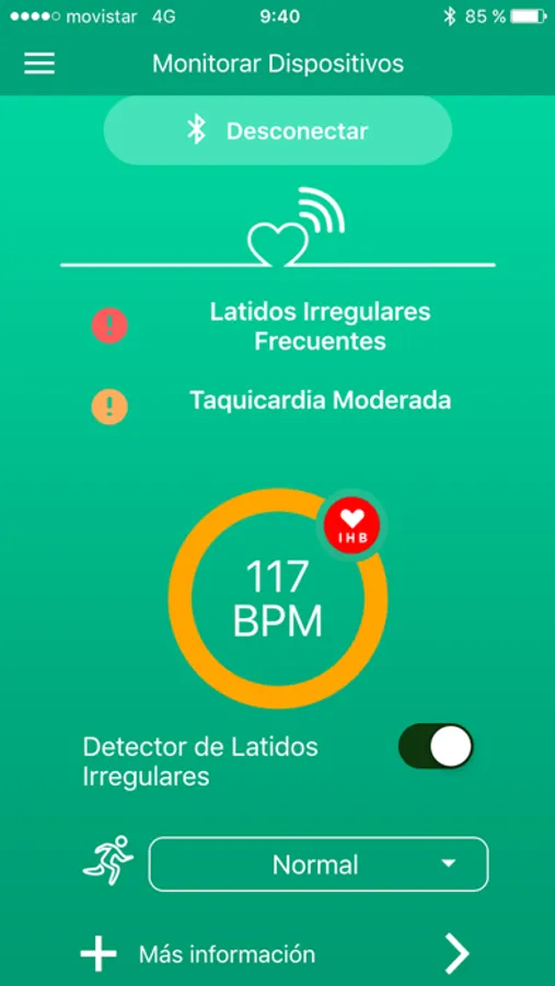 Según la severidad y tipo de alarma registrada en función del modo de actividad, Arrhythmial App enviará una alarma visual y auditiva con una guía de actuación, al propio usuario o a un tercero de su elección, para el control y monitorización de un paciente o un familiar, siempre y cuando exista consentimiento previo.