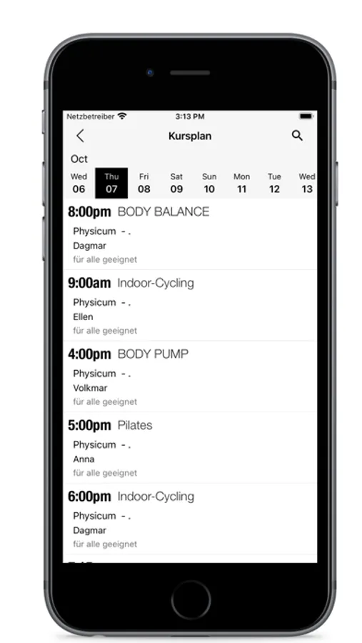 Direkter und aktueller Zugriff auf den Gruppentrainingsplan: Für jeden Kurs können Sie Details wie Zeit, Kursbeschreibung und leitender Trainer einsehen.