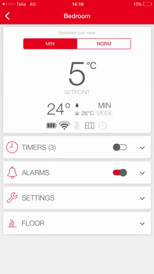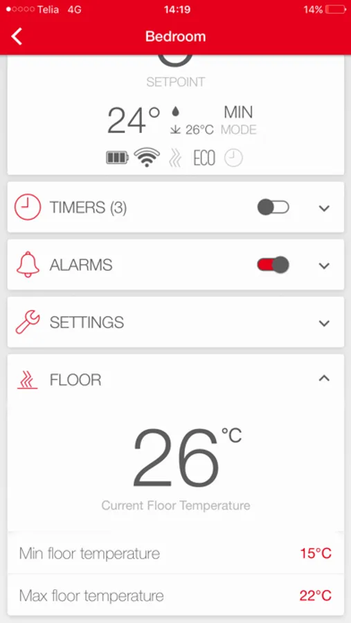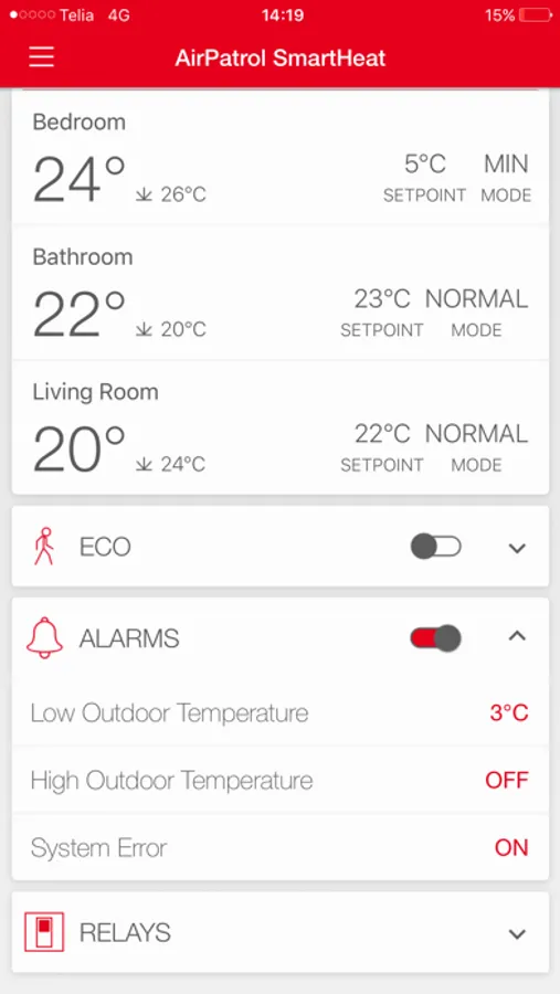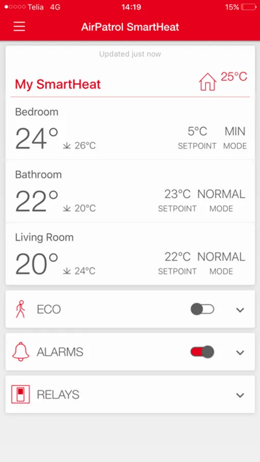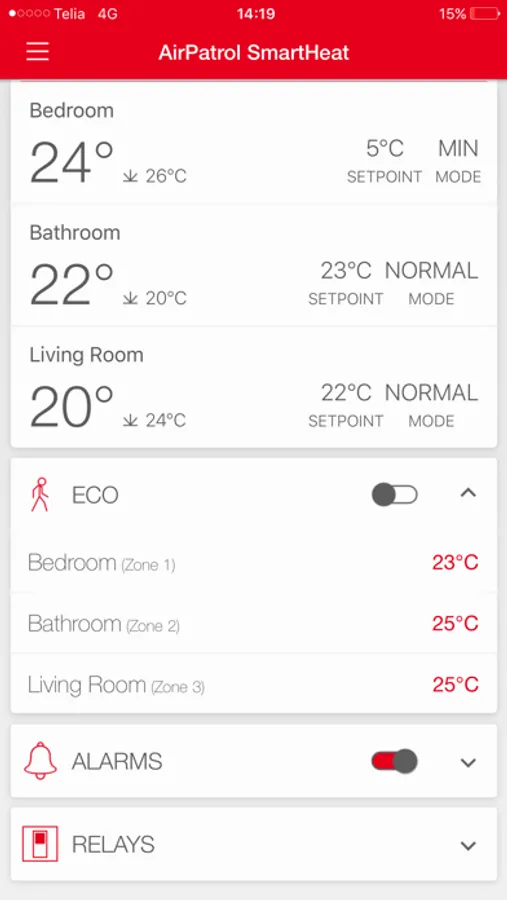 - Check current temperature in each room, adjust setpoint temperature or set up automatic timers.