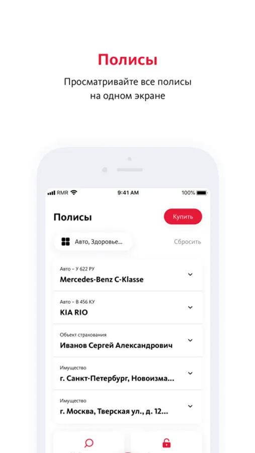 ー Хранение всех данных обо всех ваших страховых полисах в одном приложении: авто страхование (каско и ОСАГО), медицинское страхование (ДМС и онко страхование), страхование выезжающих за рубеж, страхование пассажиров, страхование имущества