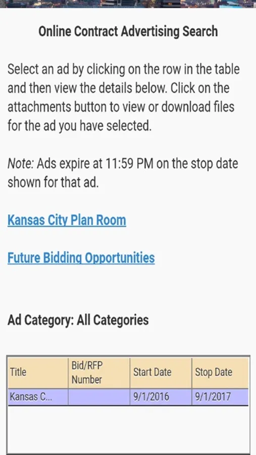 The KCMO Online Contract Advertising Search App provides an easy way to search for Bids, and view their documents on your mobile device! If you need any questions answered, or assistance with the app, please contact us at 816-513-3333 or 816-513-6646. Thank you for making Kansas City even greater!