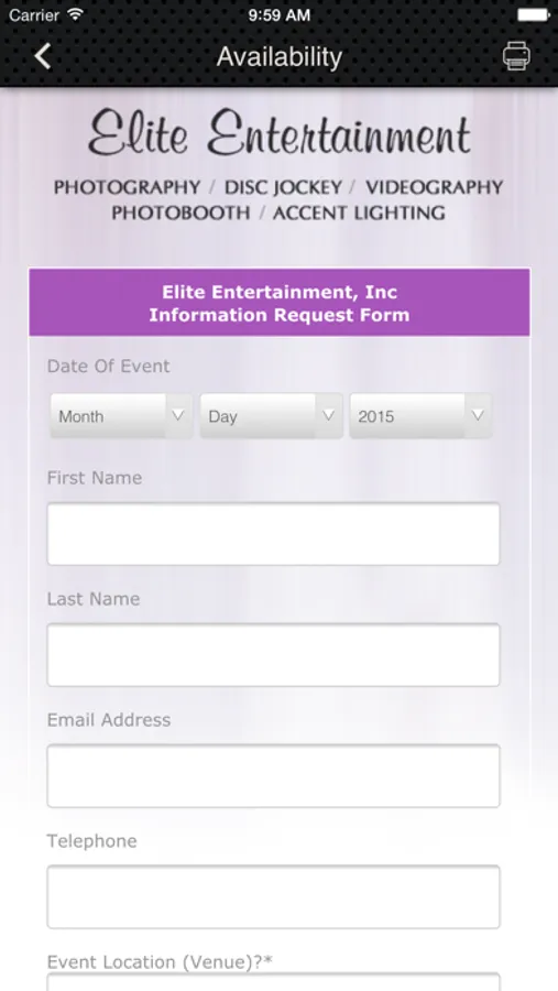 Elite Entertainment presents you this mobile app which makes it easy to check availability for your event, keep up to date on local events, and gain access to exclusive deals!