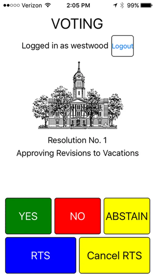 WiFi-enabled roll call voting app for use with RollCall-Pro's Meeting Manager application. Enables members to sign in, establish presence in the meeting, review the meeting agenda in PDF form, and vote on agenda items.