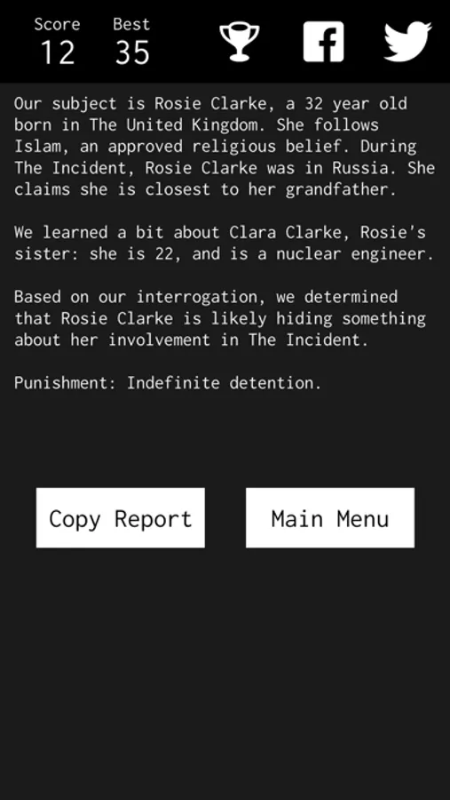 The dystopia of the future was shaken up by a catastrophic global event known as The Incident. Now the totalitarian world government, desperate for suspects, has chosen to interrogate you. Nothing is certain anymore. Can you unravel the mysterious circumstances surrounding The Incident and find the truth?