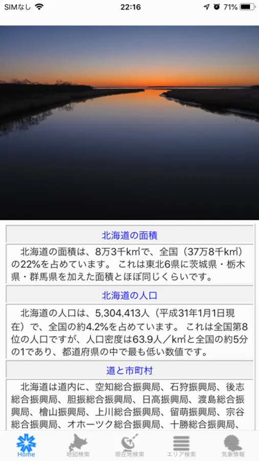 この『北の大地をめぐる旅』は、地図や写真とともに、北海道の雄大な風景、美しい景観が望めるビューポイントを紹介するアプリです。