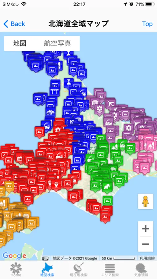 地図からビューポイントを検索します。地図上のアイコンは、「道央エリア」が赤、「道南エリア」がオレンジ、「道北エリア」が青、「十勝エリア」が緑、「オホーツクエリア」が紫、「釧路・根室エリア」がピンクで表示されます。地図上のアイコンをタップすると、ビューポイント名が表示されますので、そこをタップするとビューポイント情報が表示されます。